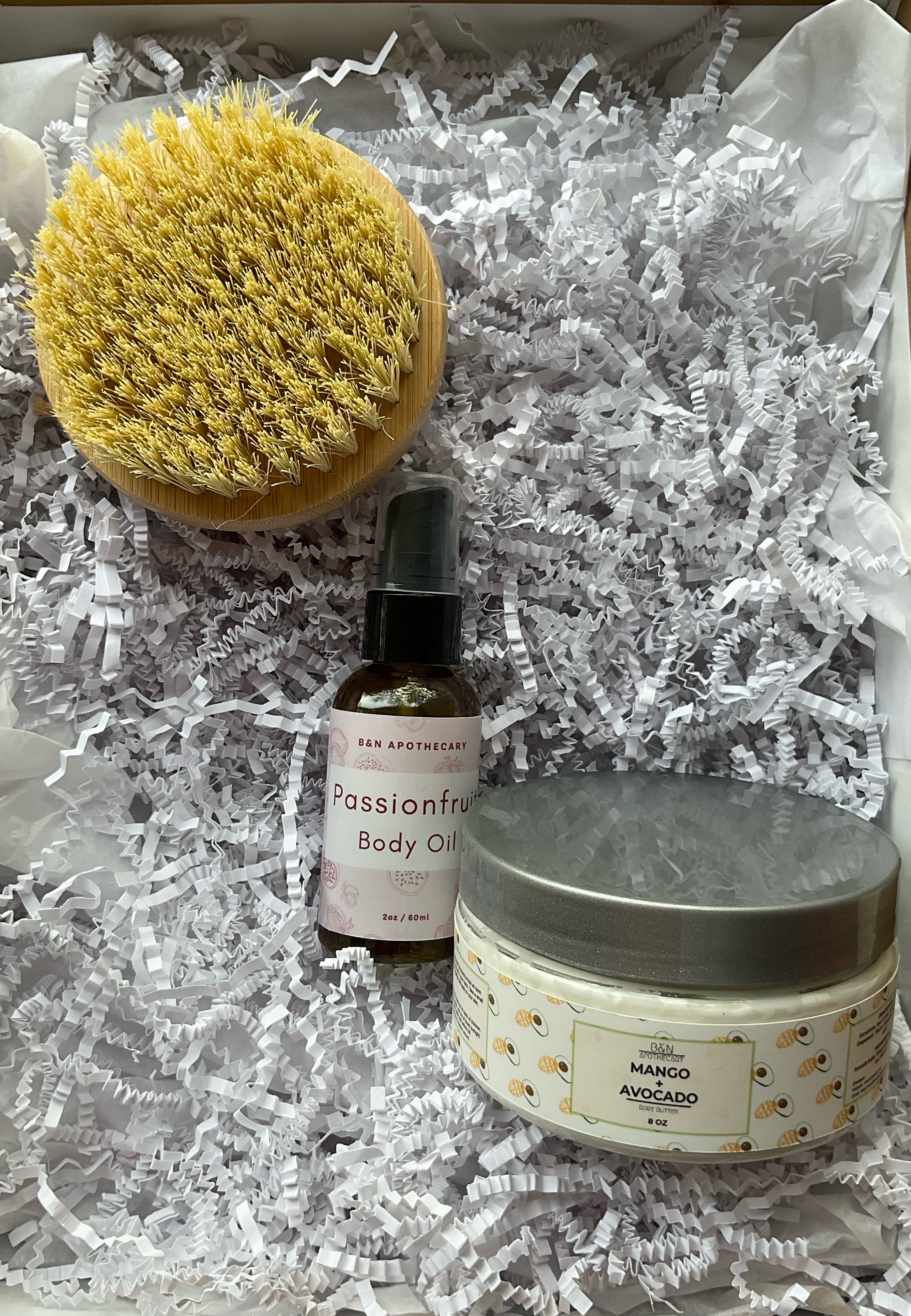 This body care bundle includes a dry brush, body oil, and your choice of our 8oz body butter.